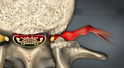 Disc rupture causing nerve compression, sharp pain, and potential limb weakness, requiring conservative or surgical management for relief.